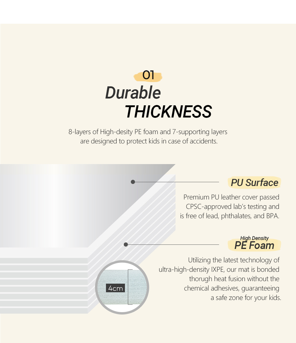 -소음 감소 및 방수 : 매트의 소음 감소 기능은 놀이와 휴식을 위한 조용한 공간을 제공하며, 방수 표면은 청소 및 유지 관리가 쉽습니다.