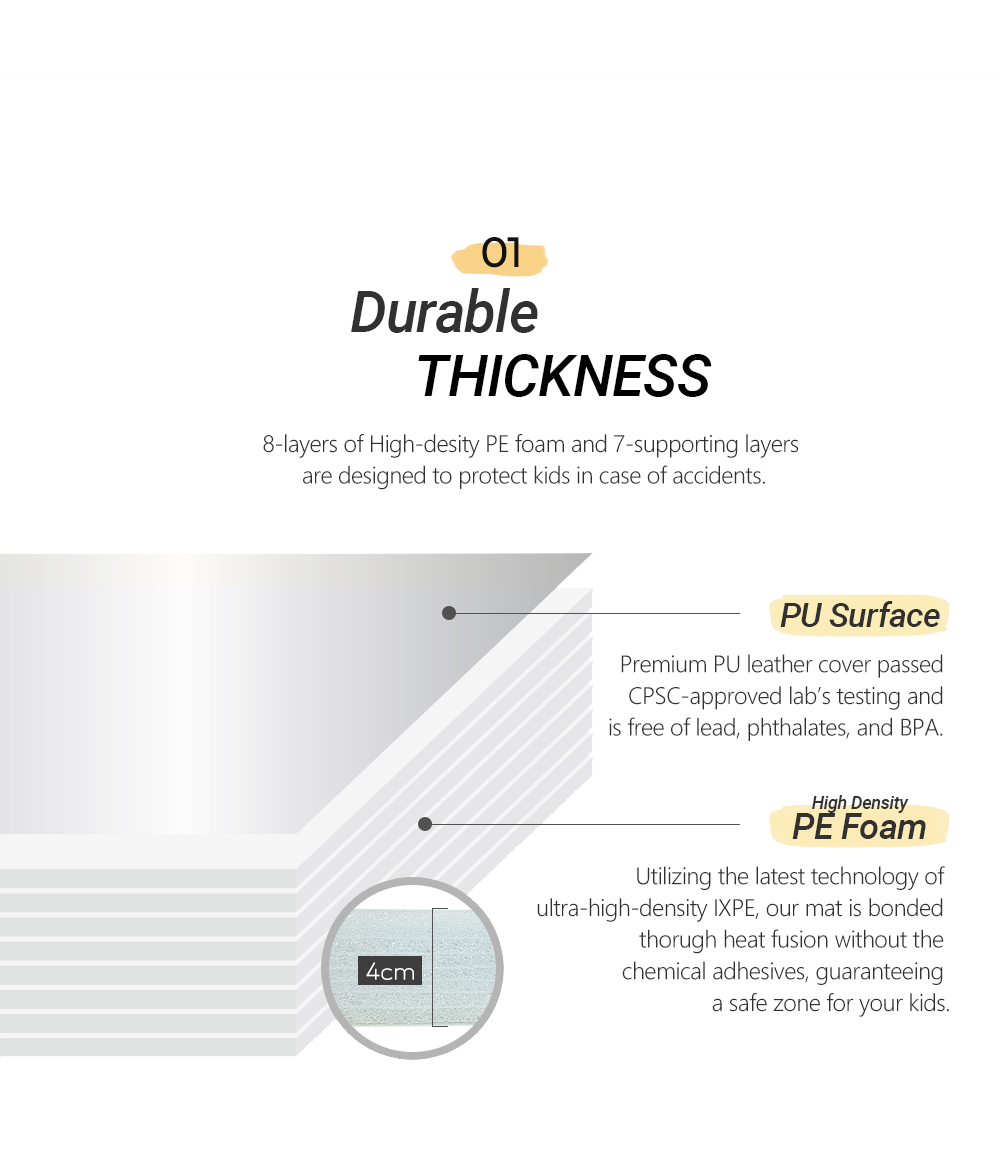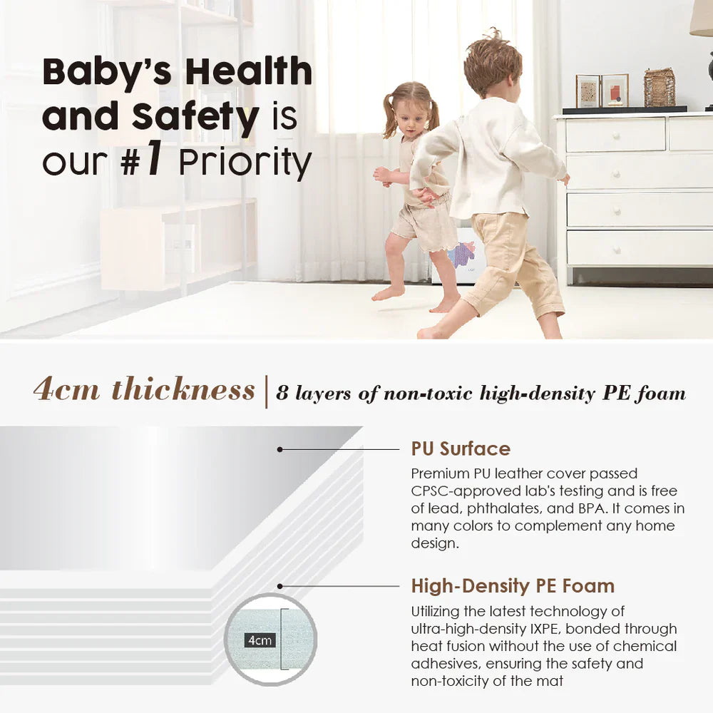 - 항균 및 안전성 : 항균 소재 로 만들어진 이 무독성 유아용 플레이 매트는 깨끗하고 위생적인 표면을 제공하여 자녀를 유해 물질과 알레르기 원인으로부터 보호합니다.
